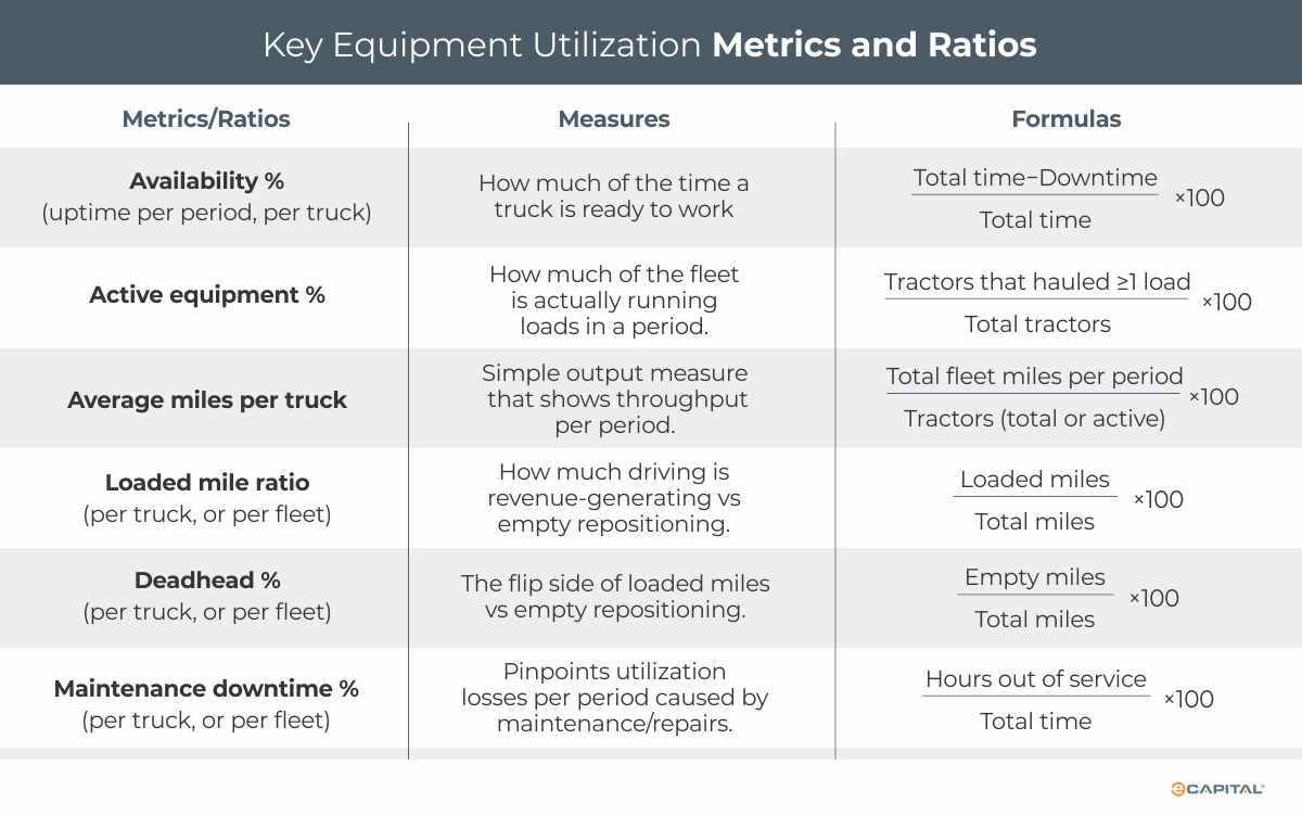 Regular monitoring of key equipment utilization metrics and ratios is recommended to support dispatch and maintenance decisions that improve uptime, reduce deadhead, and protect profitability.